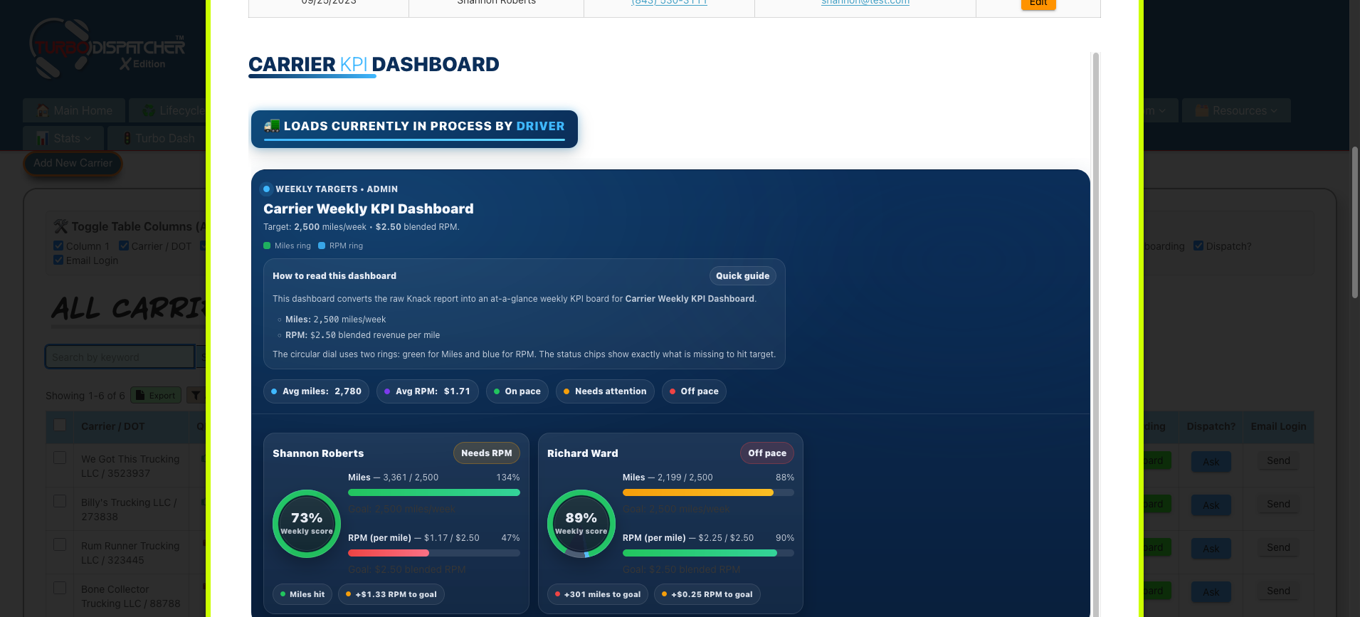 At Freight Girlz, dispatching is not based on guesswork, random load booking, or empty promises. Inside our Turbo Dispatcher TMS, we use real operational KPI dashboards that track each carrier against measurable goals like weekly miles, average RPM, and revenue performance. That means your truck is not just being dispatched — it is being managed with a clear performance strategy designed to help keep you moving, profitable, and positioned for better decisions in real time.